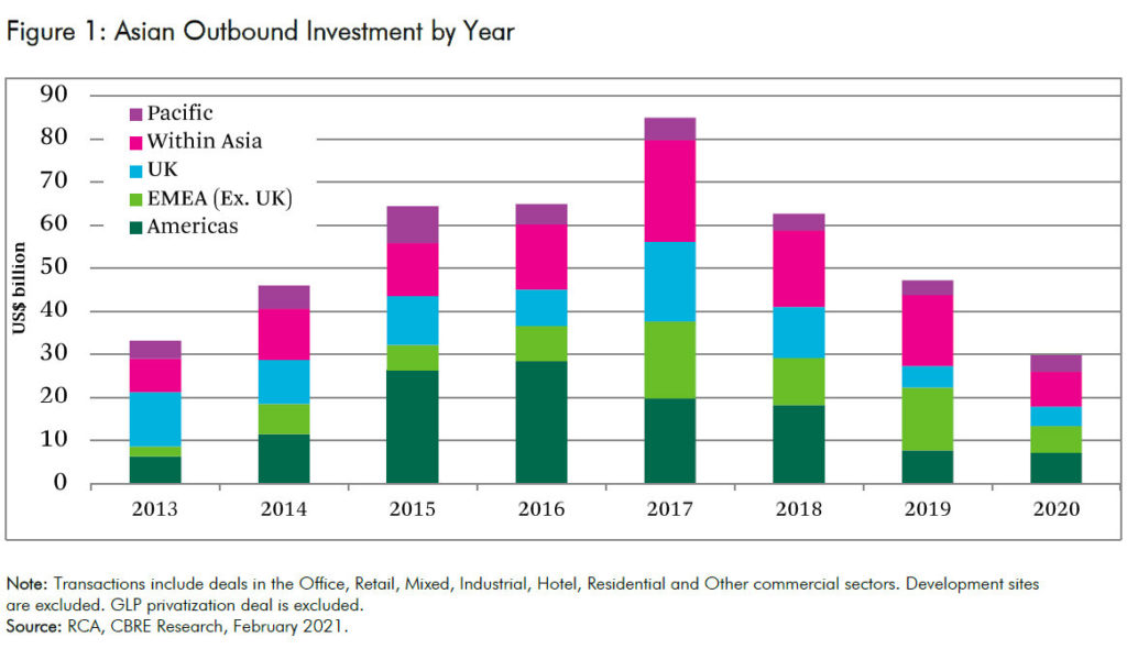 According to new research from global property consultant CBRE, Asian outbound commercial real estate investment volume declined 37% year-over-year to $30 billion in 2020, as Coronavirus-related obstacles including restrictions on travel and site inspections impeded purchasing activity.